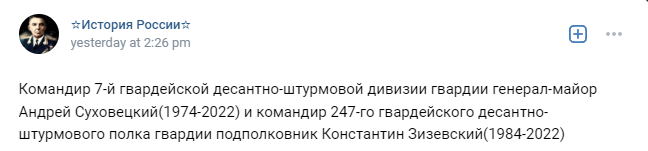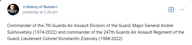 Commander of the 7th Guards Air Assault Division of the Guard, Major General Andrei Sukhovetsky [Cargo ID #10](1974-2022) and commander of the 247th Guards Air Assault Regiment of the Guard, (then) Lieutenant Colonel Konstantin Zizevsky [Cargo ID #27] (1984-2022)