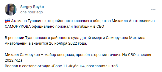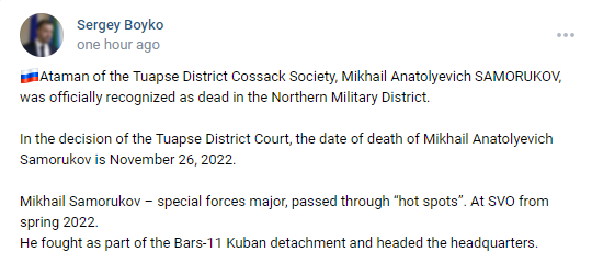 Ataman of the Tuapse District Cossack Society, Mikhail Anatolyevich SAMORUKOV, was officially recognized as dead in the Northern Military District.