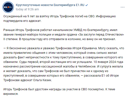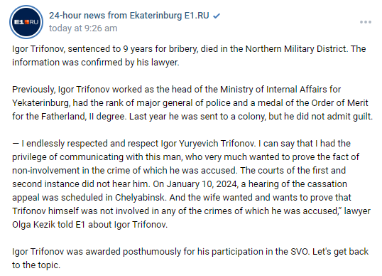 According to the lawyer of the former general Olga Kezik, Trifonov has been asking to go to the combat zone since March 2023, but he was refused for a long time. Sending to the front was approved only in November 2023. Trifonov died, presumably in December.