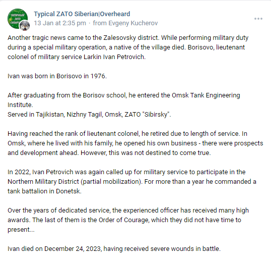 He left three sons, the eldest of whom is studying at the Omsk Polytechnic University, the middle one is in the cadet corps, and the youngest is at school. Lieutenant Colonel Ivan Larkin was buried at the Borisov cemetery on January 14.