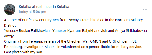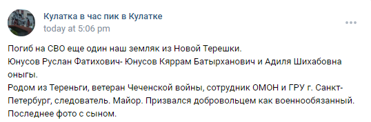 Details. The list, which included 296 names, was published by the military telegram channel “Spy Dossier”. Prigozhin Evgeniy Viktorovich, number 195 on the list, was the only one with a second surname, first name and patronymic - Yunusov Ruslan Fetikhovich. In February, the administration of the Terengulsky district of the Ulyanovsk region reported about the death of Yunusov in the war in Ukraine. In the community of residents of the Starokulatsky district of the Ulyanovsk region, on January 22, Yunusov was called “our fellow countryman from Novaya Tereshka” (the post has now been deleted , but screenshots have been preserved ).