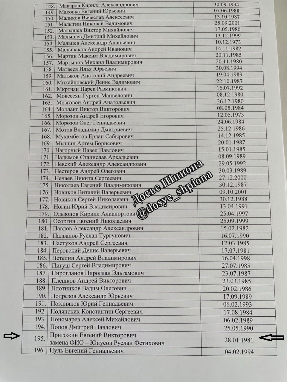 ▪️Fontanka then found out that Yunusov changed his last name, first name and patronymic a year earlier - he received a passport in the name of Prigozhin on May 26, 2018. In the past, according to the publication, Yunusov served in the SOBR and criminal investigation department, and participated in military conflicts. Before his arrest in 2019, Yunusov explained the change of name by the “type of his activity” as a security guard.