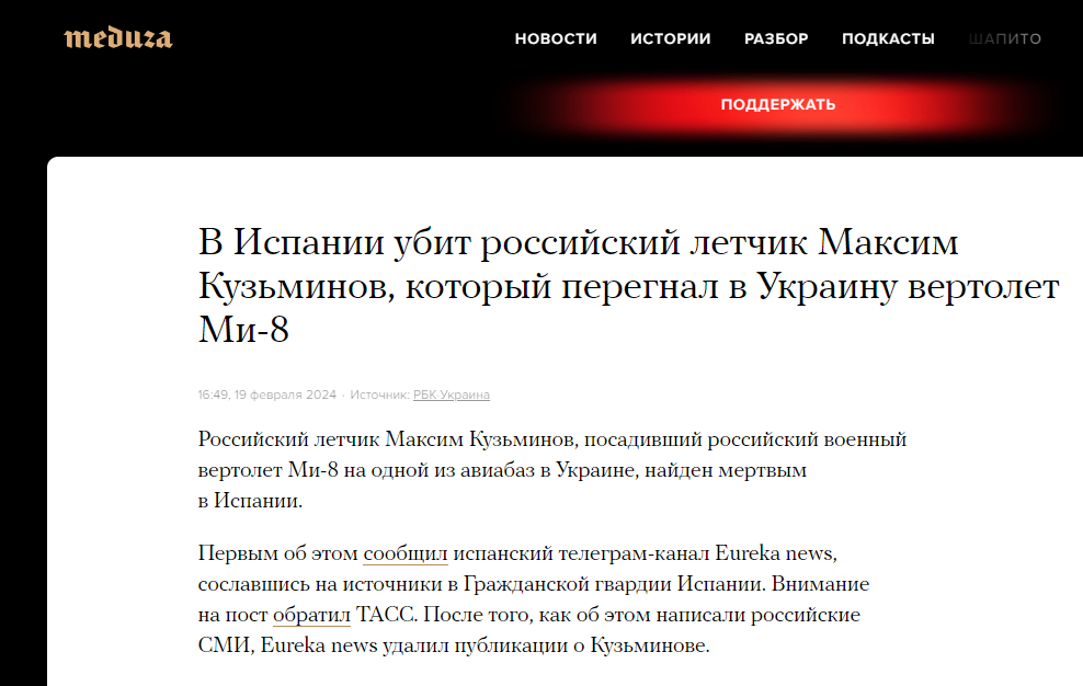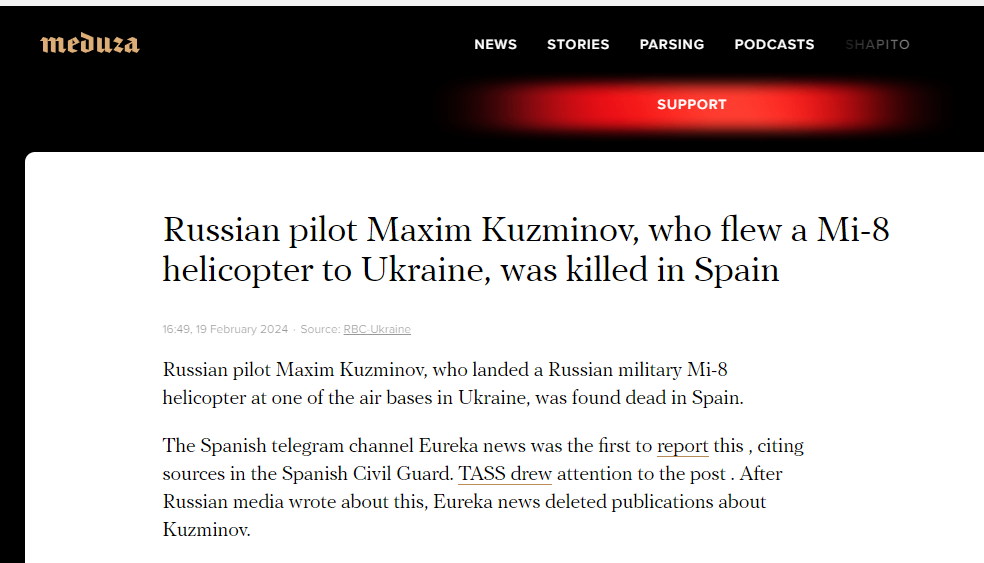 "In October last year, the Rossiya 1 TV channel aired a report in which fighters who introduced themselves as special forces soldiers of the Main Intelligence Directorate (GRU) said that pilot Kuzminov “will not live to see trial.” Behind the scenes, the journalist notes that the order to physically eliminate Maxim Kuzminov “has already been received,” and its execution is only “a matter of time.” The military personnel, in turn, promise to punish the defector pilot."