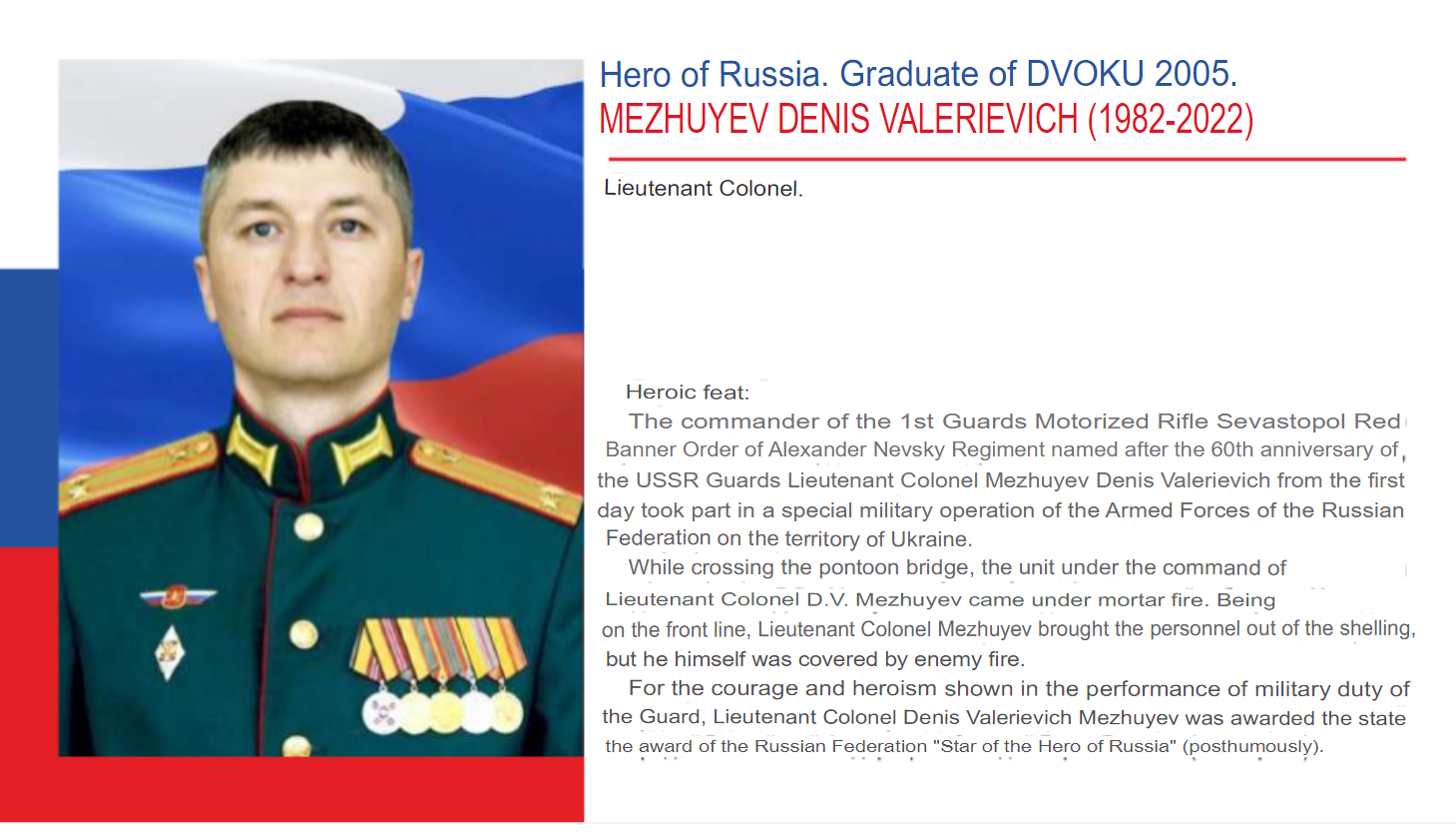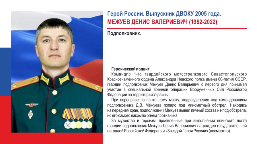 On April 10, 2022, Denis Mezhuev’s unit, when advancing for reconnaissance to a given line, crossed the Seversky Donets River along a floating bridge. During the crossing, russian motorized riflemen came under mortar fire from the Ukrainian Armed Forces. The commander himself was mortally wounded.
