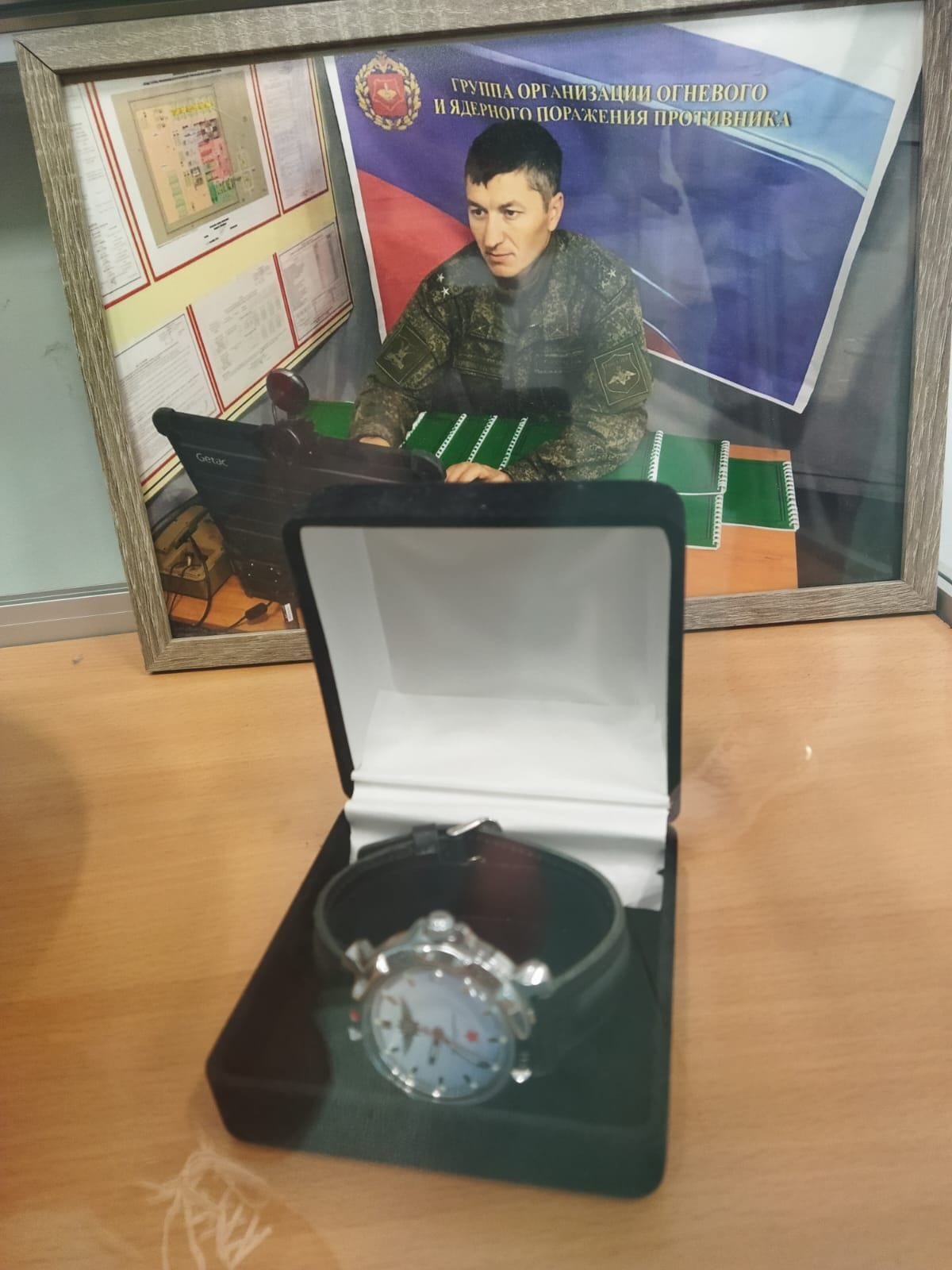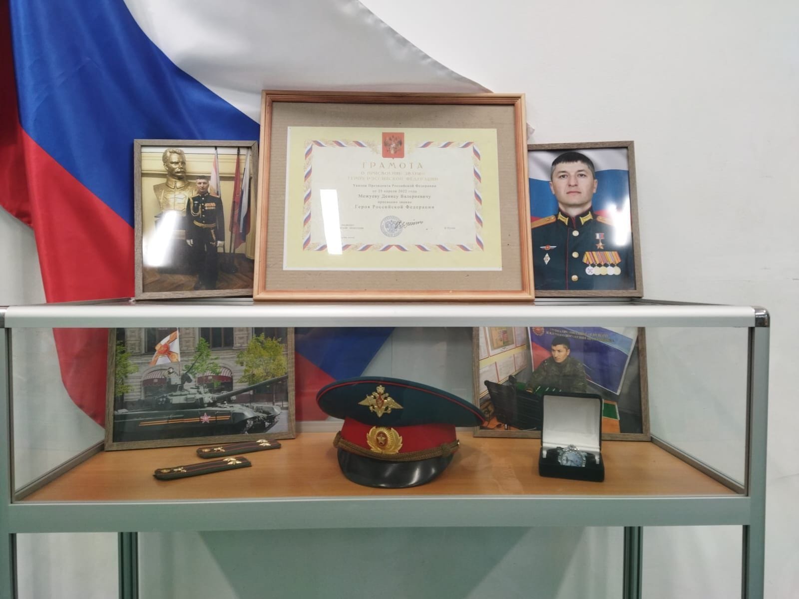 “The stand displays the personal belongings of a special operation hero who died while performing military duty in April 2022. Denis Valerievich Mezhuev left, defending our Motherland, Faith and the lives of our people. His memory will remain in our hearts forever! Today, the heroic actions of our soldiers and officers make it possible to successfully repel any enemy attacks, and most importantly, save the lives of subordinates,” said Andrei Mikhailov, executive secretary of the local United Russia, coordinator of the party’s “Historical Memory” project."