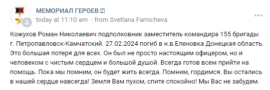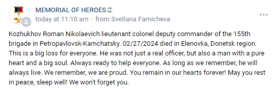 Recently, our army has begun to rapidly lose many experienced commanders in rather suspicious incidents. So, for example, during the formation on the occasion of the award, on February 27 in Elenovka, Lieutenant Colonel Roman Nikolaevich Kozhukhov, Major Alexander Abilov [Cargo ID #1149] (pending), Captain Nail Shakhmanov and 16 other professional soldiers from the 155th Marine Brigade were killed.