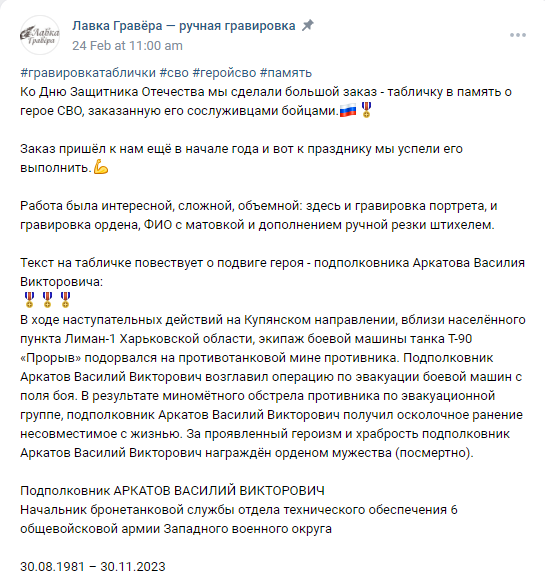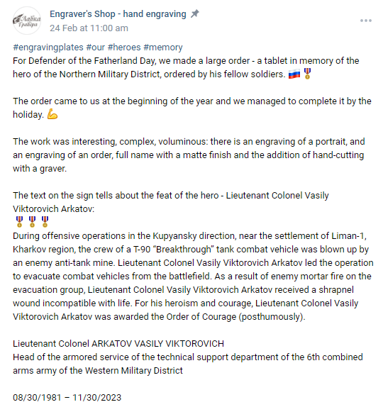 Whilst trying to evacuate a T-90M tank disabled by an AFU anti-tank mine, he came under mortar fire and received shrapnel wounds incompatible with life.