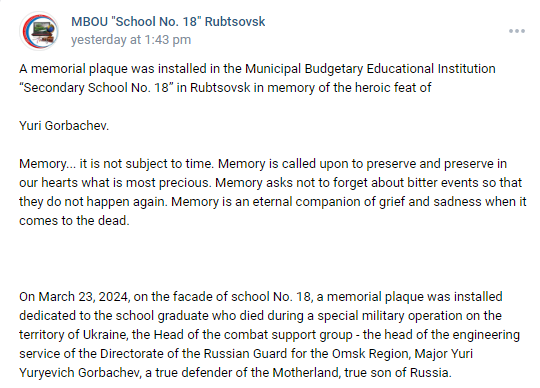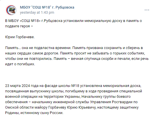 On March 23, 2024, on the facade of school No. 18, a memorial plaque was installed dedicated to the school graduate who died during a special military operation on the territory of Ukraine, the Head of the combat support group - the head of the engineering service of the Directorate of the Russian Guard for the Omsk Region, Major Yuri Yuryevich Gorbachev