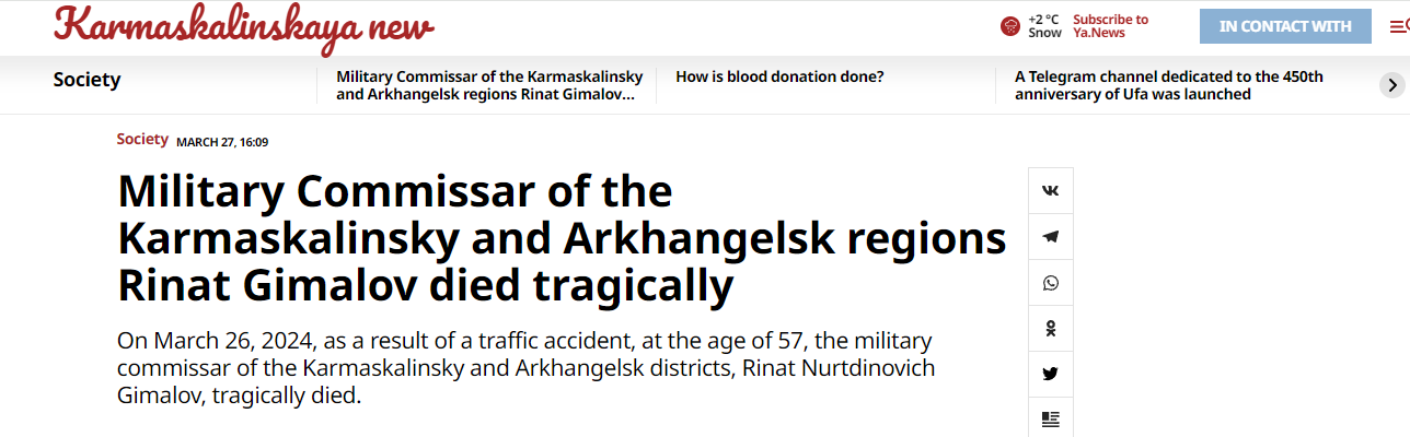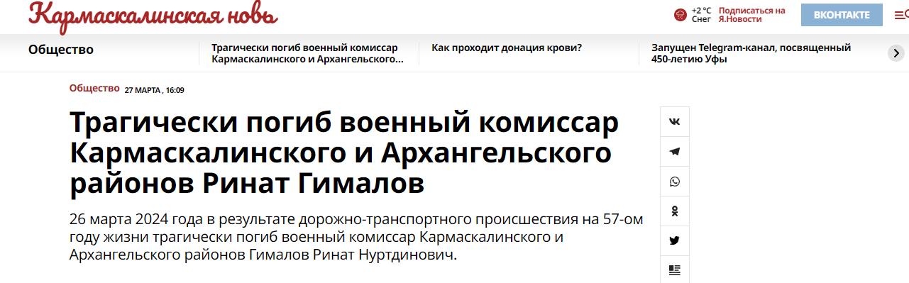 A serious accident occurred last Tuesday evening on the Ufa-Beloretsk highway. There, at the 15th kilometer of the road, two foreign cars collided. In one of them was the military commissar of the Karmaskalinsky and Arkhangelsk regions, Rinat Gimalov.