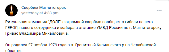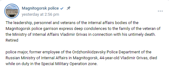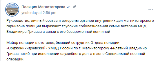 On February 2, 2024, Vladimir Mikhailovich Grivas died while performing a combat mission in the village of Pobeda, Maryinsky district, Donetsk Republic.