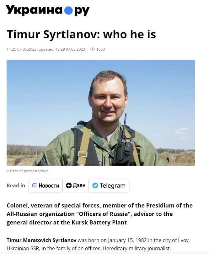 The image below is currently being spread as a photo of Timur Myasnikov, it is not him. The photo is of Colonel Timur Maratovich Syrtlanov. Anyone claiming this is Colonel Timur Mikhailovich Myasnikov has not done even basic fact checking.
