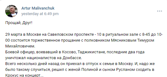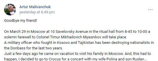 Timur was wounded in the Crocus City Hall terrorist attack on March 23rd, 2024. He had been fighting on the front lines of Ukraine since the start of the war, and was on leave at home for a few days before returning to the front. He took his family to the concert venue, and was the only member of his family to be shot. He suffered two shots to the stomach and one to the face. He was brought to a Moscow hospital where he died 3 days later.