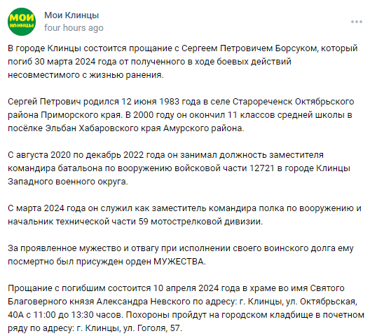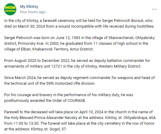 ▪️ Since March 2024 - deputy regiment commander for weapons, head of the technical unit of the 59th motorized rifle division."
