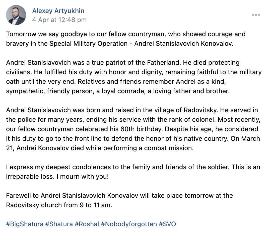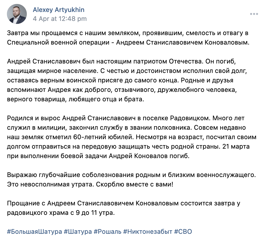 Andrei Stanislavovich was born and raised in the village of Radovitsky. He served in the police for many years, ending his service with the rank of colonel. Most recently, our fellow countryman celebrated his 60th birthday. Despite his age, he considered it his duty to go to the front line to defend the honor of his native country. On March 21, Andrei Konovalov died while performing a combat mission.