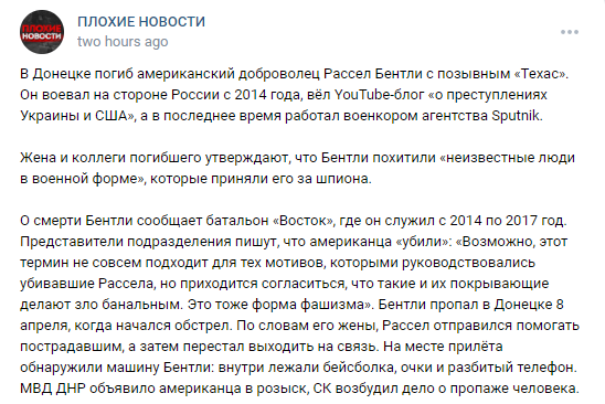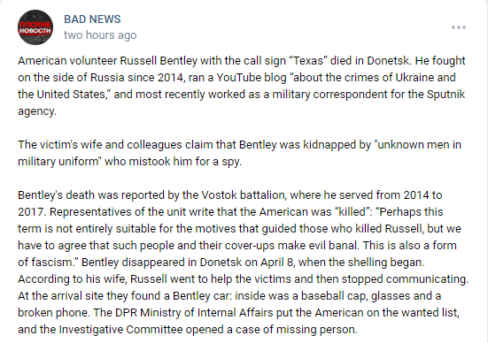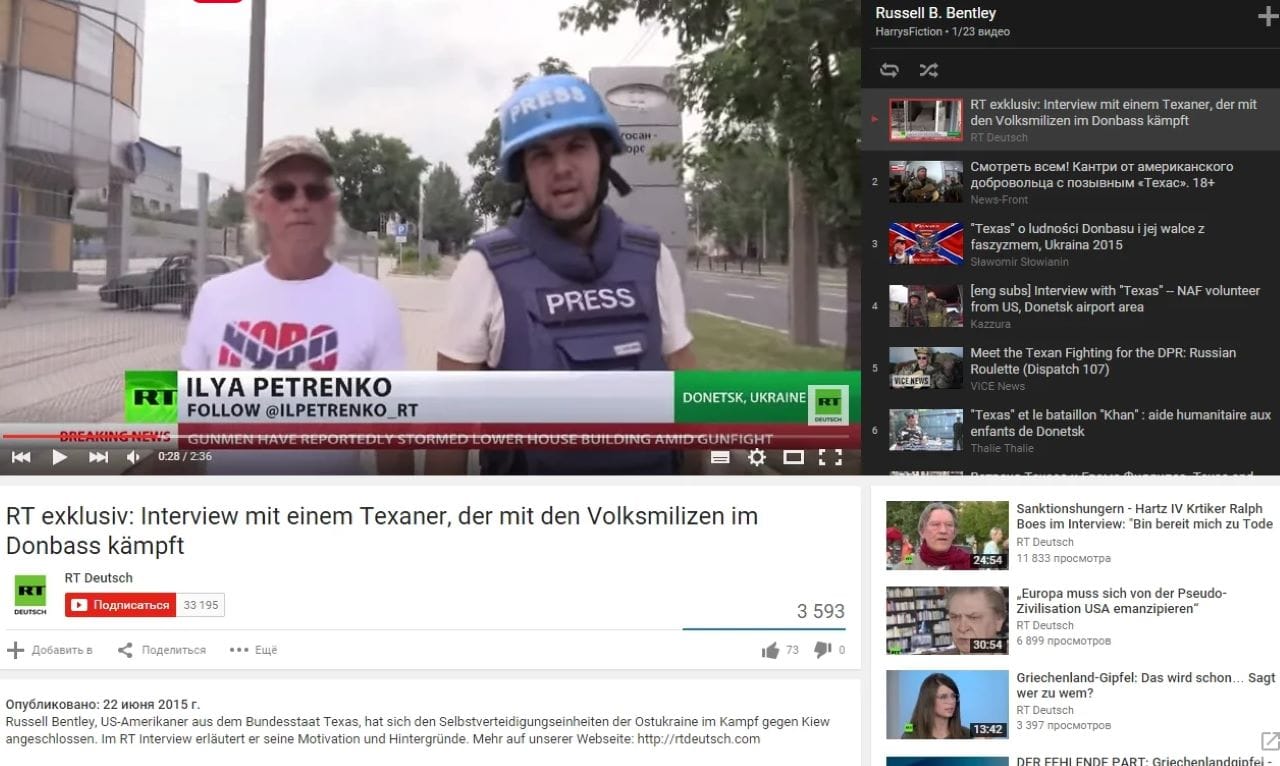 When the Maidan Revolution broke out in 2014, Bentley blamed it on the CIA and George Soros. Determined to head to the frontlines in Donbas, Bentley booked a flight for Rostov-on-Don. Before he left Texas, he recorded a song about his belief that this was “Armageddon” and he was choosing his side with “Novorussia.” He sang: “The U.S. is wrong, and I’ll do more to right it than just write this song.”