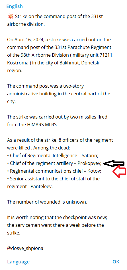 Chief of Artillery - Lieutenant Colonel Unit: 331st Guards Airborne Regiment, 98th Guards Airborne Division Cargo ID: #1250 English Name: Dmitry Petrovich Prokopyev Russian Name: Прокопьев Дмитрий Петрович Date of Birth: March 16, 1975 (age: 49 years) Place of Birth: Shumerlya, Chuvash Republic, Russia Date of Death: April 16, 2024