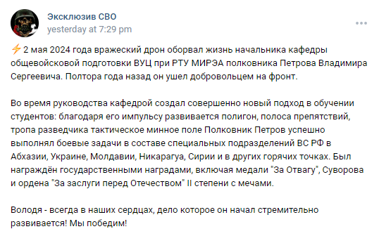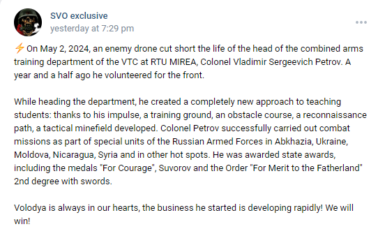 Previously: Head of the Combined Arms Training Department of the VUC (Military Training Center) at RTU MIREA (Russian Technological University MIREA)