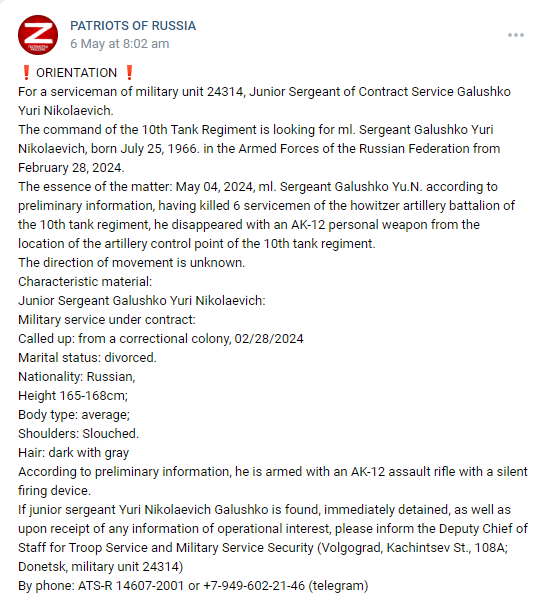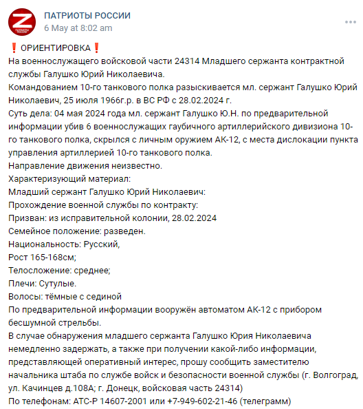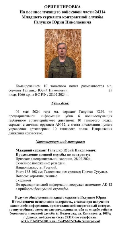 Galushko killed six colleagues, including the commander, and then fled with his personal AK-12 weapon. The shooting occurred on May 4. The man is wanted.