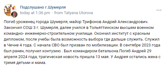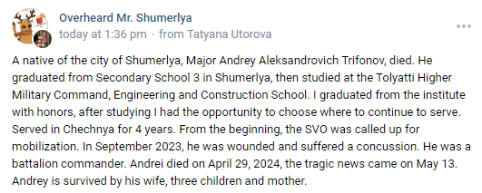 Major Trifonov, was wounded in September of 2023 and ended up in the same hospital in Voronezh as Major Andrey Evgenievich Gromov, who he took over command of the 3rd Battalion from when he was wounded on 19th August, 2023 "severe concussion and shrapnel wounds in the head, leg and arm, eye damage, and lost consciousness.", Major Trifonov evacuated him and then took over command of the 3rd Battalion.