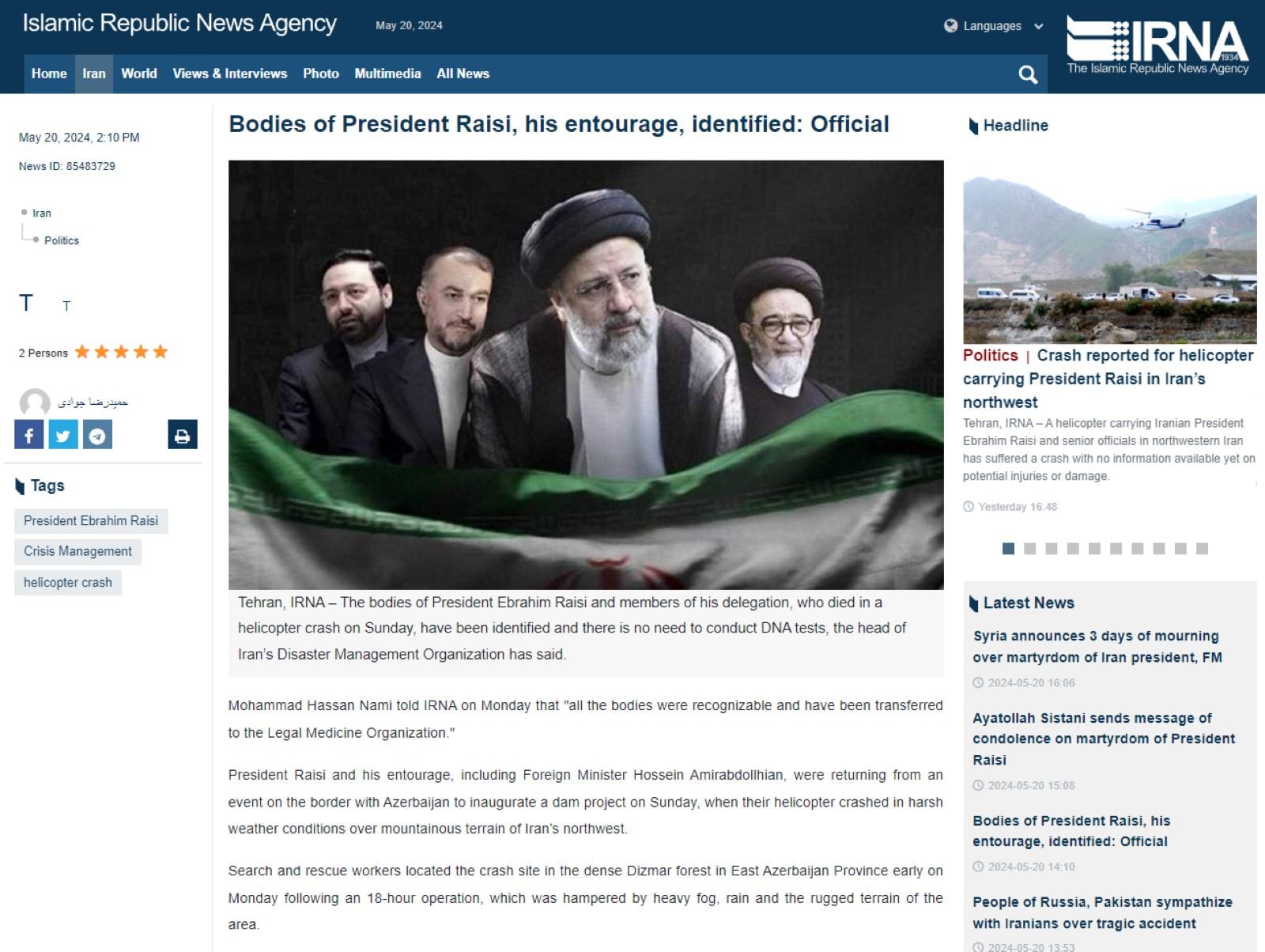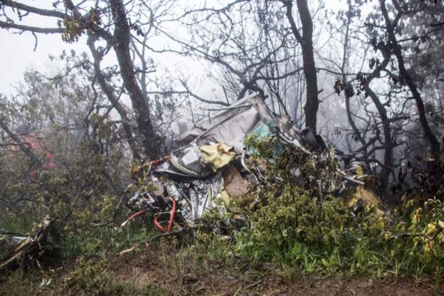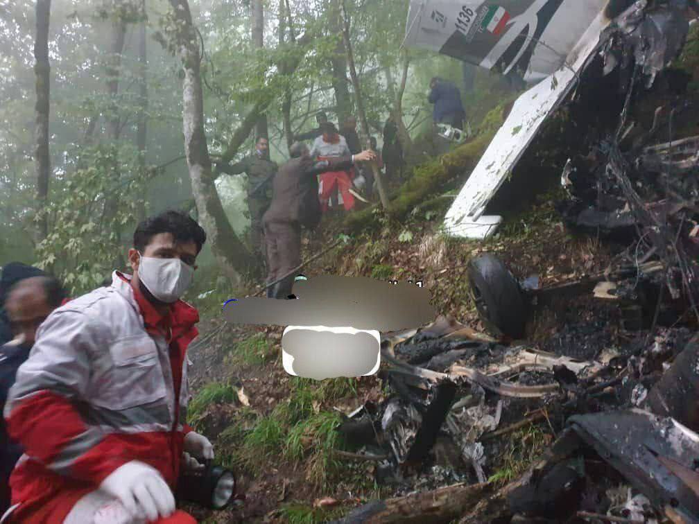 At around 13:30 IRST (UTC+03:30), the helicopter crashed approximately 2 kilometers (1.2 mi) south west of the village of Uzi in the Dizmar Forest region. With the exception of its tail, the helicopter was completely destroyed in the impact. Search operations ended on May 20th, following the recovery of the bodies of those on board. Many of the bodies were found to be in a charred condition, but were still identifiable visually.