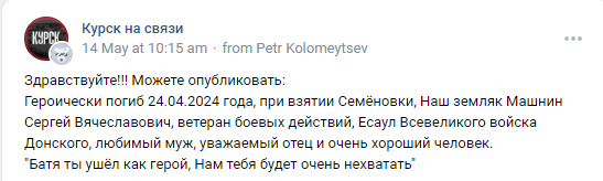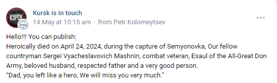 "My dearest husband died on April 24, 2024. He did not surrender, even when wounded, he let the enemy come closer and blew them up along with himself..."