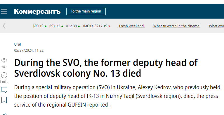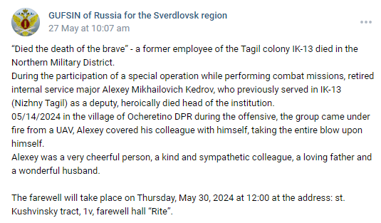 “Retired internal service Major Alexey Mikhailovich Kedrov, who previously served in IK-13 as deputy head of the institution, died heroically"