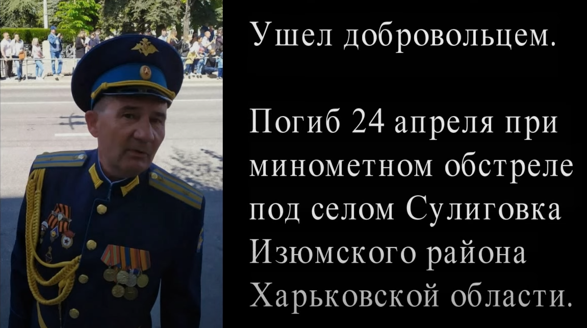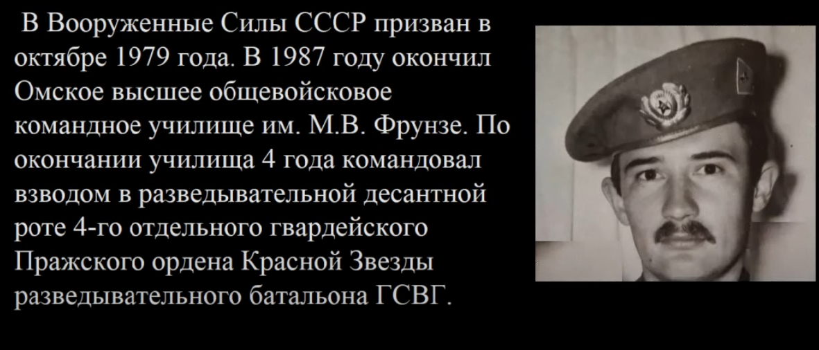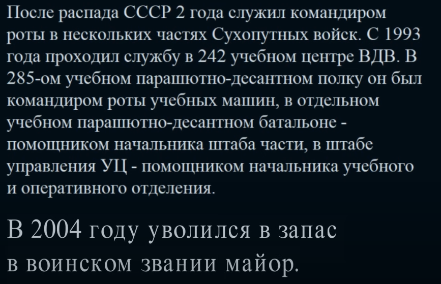 "He was drafted into the Armed Forces of the USSR in October 1979. In 1987 he graduated Omsk Higher Combined Arms Command School named after M.V. Frunze. After graduation, he commanded a platoon for 4 years in the reconnaissance amphibious company of the 4th Separate Guards Prague Order of the Red Star of the GSVG Reconnaissance Battalion.""After the collapse of the USSR, he served for 2 years as a company commander in several units of the Ground Forces. Since 1993 he served in the 242nd Airborne Training Center for a year. In the 285th training parachute regiment, he was the commander of a company of training vehicles, in a separate training parachute battalion - assistant to the chief of staff of the unit, in the headquarters of the management of the UC - assistant to the head of the training and operational department. In 2004, he retired to the reserve with the military rank of major."Since 2017, he has worked as an officer educator in the Omsk Cadet Military Corps."He left as a volunteer. He died on April 24 in a mortar attack near the village of Suligovka, Izyumsky district,"