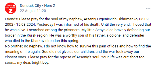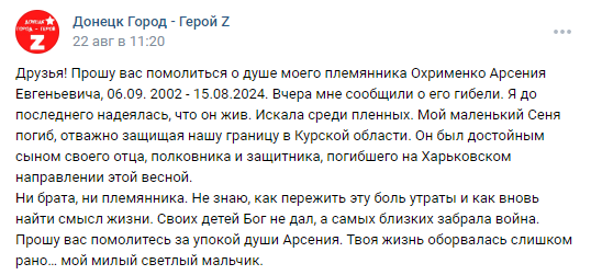 Oksana is the sister of Evgeniy Yuryevich Okhrimenko [Cargo ID #1350]. However, she was not posting about Evgeniy's death, she was posting about Evgeniy's son, Arseniy Evgenievich Okhrimenko (pictured below) dying in the Kursk region. She only mentions Evgeniy in passing ("his father, a colonel and defender who died in the Kharkiv direction this spring"), and not even by name.