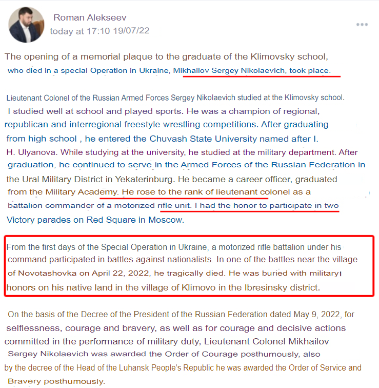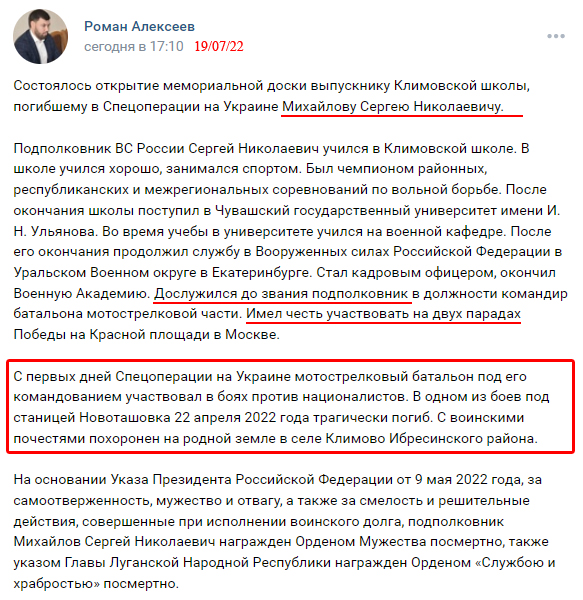 On July 19, 2022, in the village of Klimovo, Ibresinsky district, a solemn meeting was held dedicated to the opening of a memorial plaque to Sergei Nikolaevich Mikhailov, who died in the Special Operation in Ukraine.