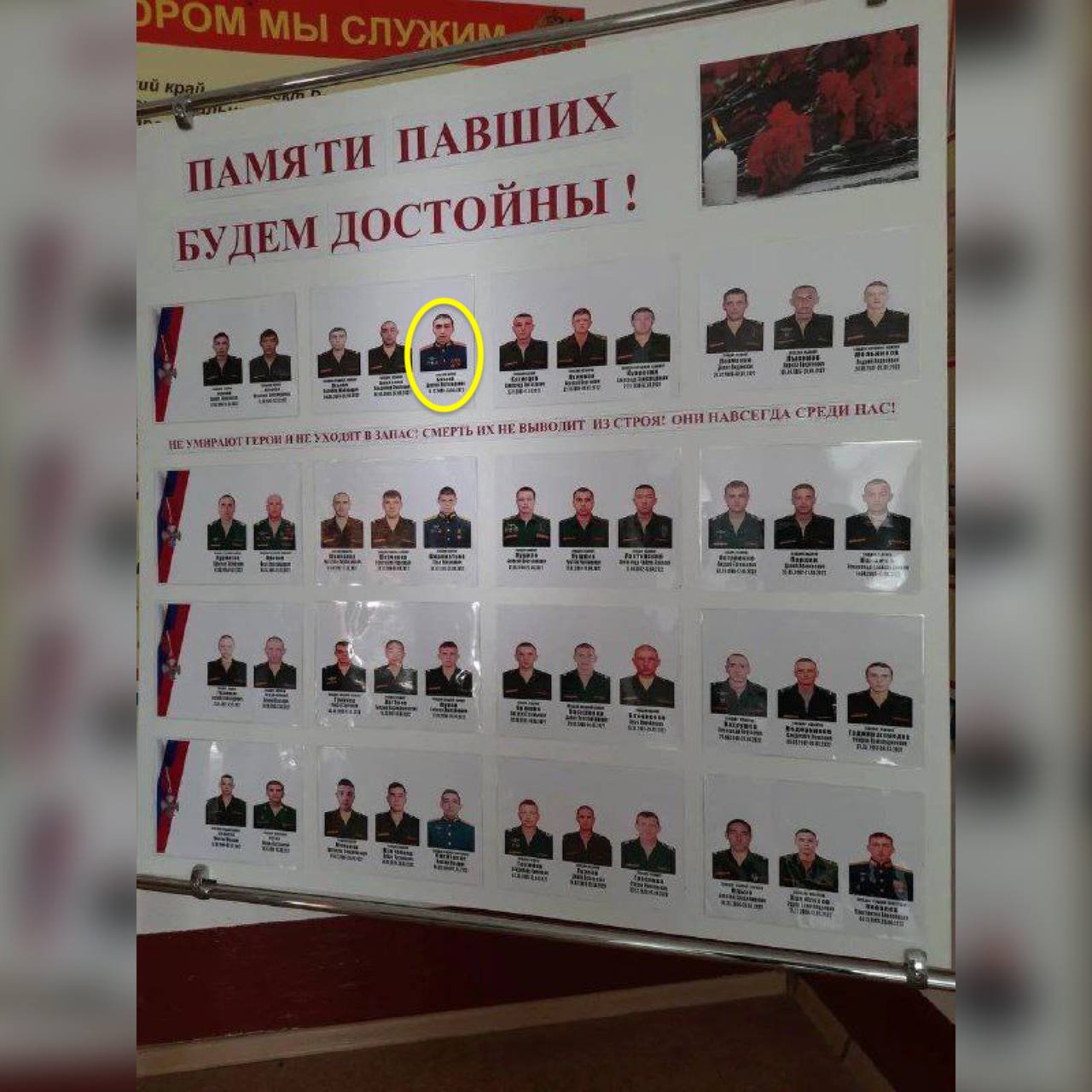 "Soldiers of the 64th separate Guards motorized rifle brigade - holders of the "Order of Courage" (posthumously), who died during special military tasks on the territory of Ukraine and the LDNR. On the stand 1/10th part of all the dead from the personnel of the brigade, which practically does not exist."