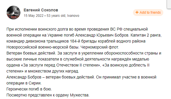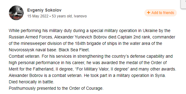 By decree of the President of the Russian Federation, Captain 2nd Rank Alexander Yuryevich Bobrov was posthumously awarded the Order of Courage.