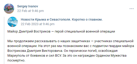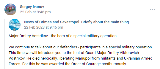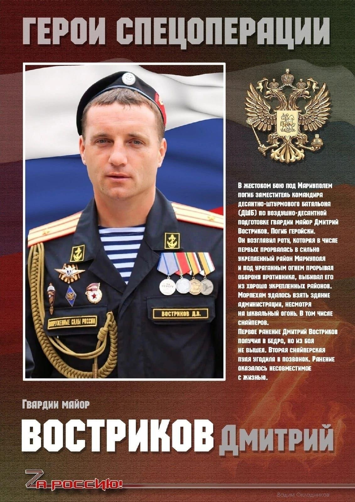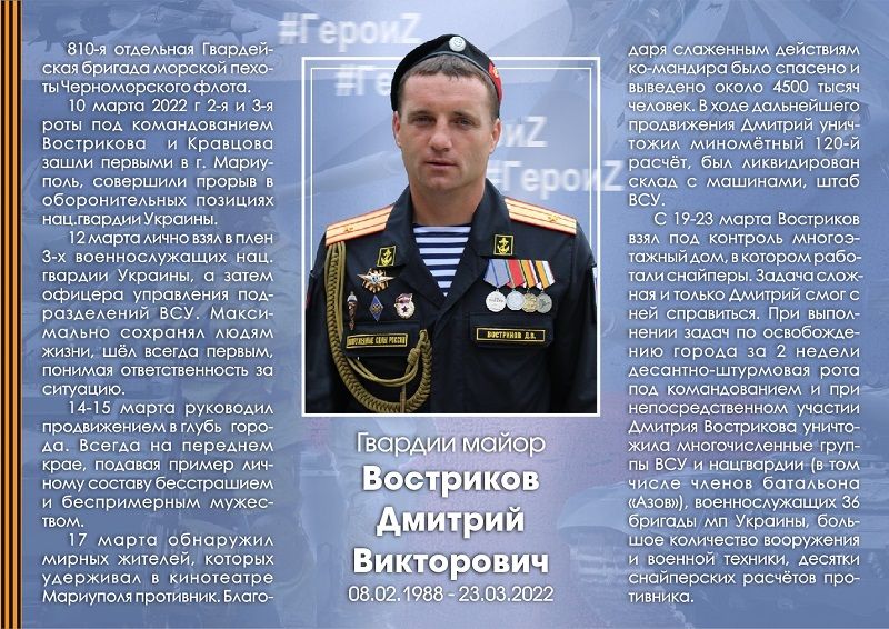 Separately, I would like to talk about the deputy commander of the airborne assault company, Major Dmitry Vostrikov. He always went ahead of his unit, and the battles in Mariupol were no exception. When it became necessary to suppress another enemy firing point located in a residential building, Vostrikov took six marines with him and advanced to the rear of the enemy. Coming close to the high-rise building, the major eliminated this point with a grenade launcher, allowing his unit to capture the building. However, at the same time, the Marine himself died at the hands of a sniper.