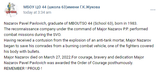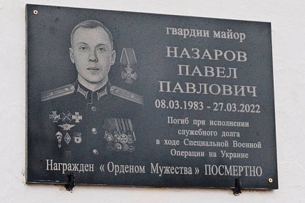 "Having received a concussion from the explosion of an anti-tank mortar, Major Nazarov began to save his comrades from a burning combat vehicle, covered one of the fighters with his body from bullets."