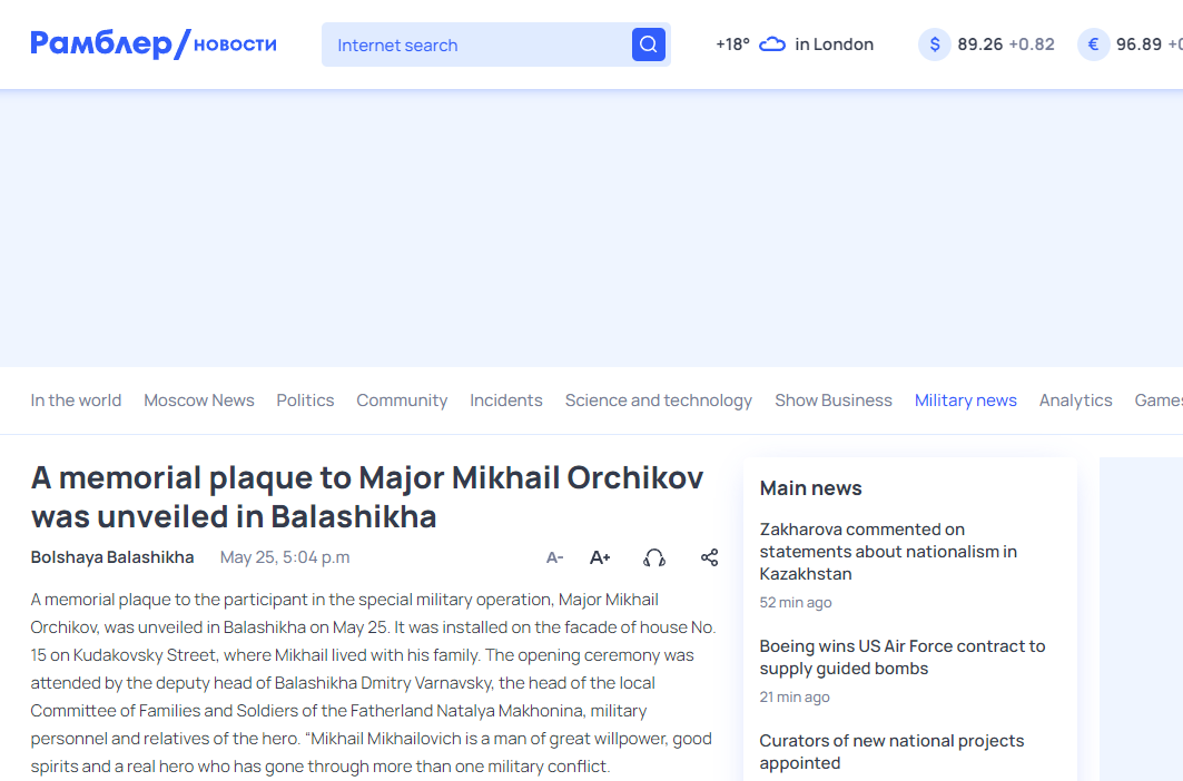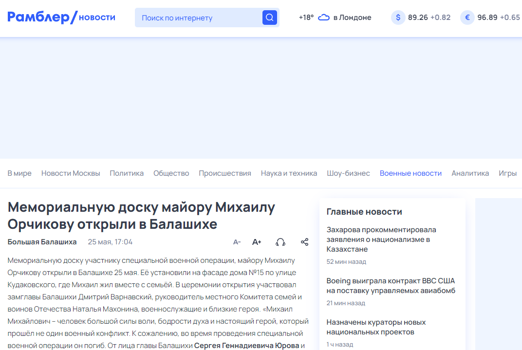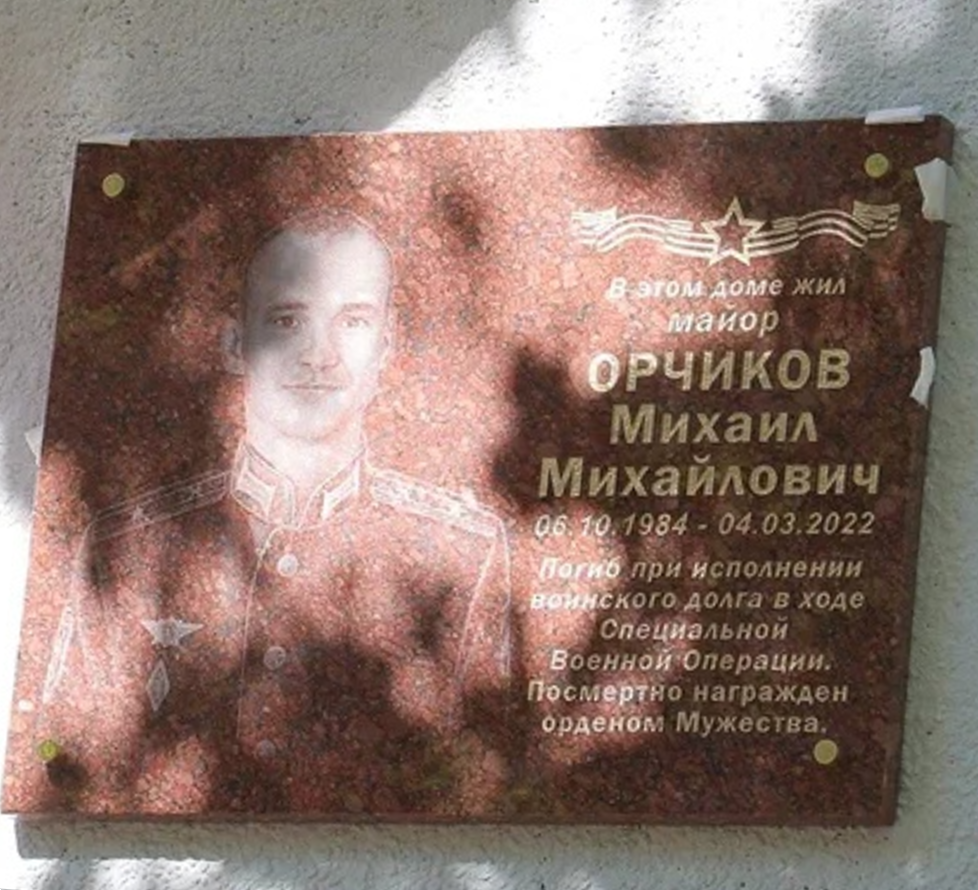 A memorial plaque to the participant in the special military operation, Major Mikhail Orchikov, was unveiled in Balashikha on May 25. It was installed on the facade of house No. 15 on Kudakovsky Street, where Mikhail lived with his family.