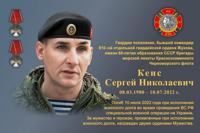 Sergey Nikolaevich Kens, a graduate of school 422 in 1997, Guards Colonel, Chief of Staff - Deputy Commander of the 20th Guards Motorized Rifle Division of the Armed Forces of the Russian Federation, ex-brigade commander of the 810th Marine Brigade, died on July 10, 2022 in Ukraine in the line of duty.