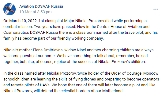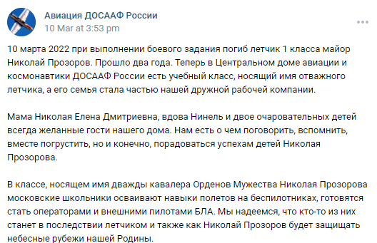 On March 10, 2022 our friend, Major Nikolai Prozorov, died in a combat flight on an Su-25 attack aircraft. From the first minutes of flight he knew that he was being "irradiated". Having fulfilled the task 100%, he did not eject in order not to be taken prisoner. Nikolai died as a Hero, not surrendering to the enemy. Eternal flight to you, our dear one. You are alive in our hearts!