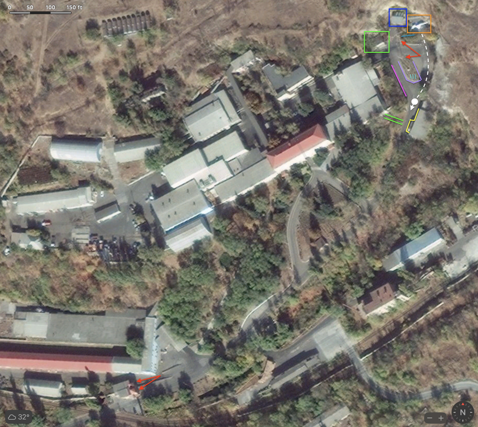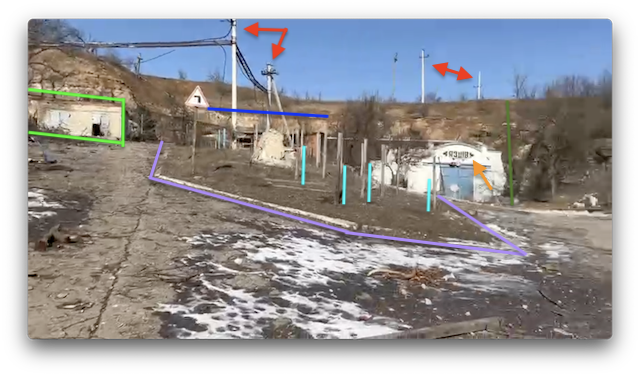 Here you can see all of the unique features highlighted, with the position of Prigozhin and his camera crew in White. The white arrow indicates the direction they were initially filming in, then then dashed line indicates the path of their retreat into the АЗШВ warehouse.