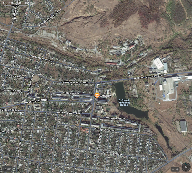 The word "АЗШВ" can be clearly seen on a rather unique white building. A quick Google search shows АЗШВ to be Artwinery, a Ukrainian sparkeling wine producer based out of Bakhmut. A quick map search places them here: