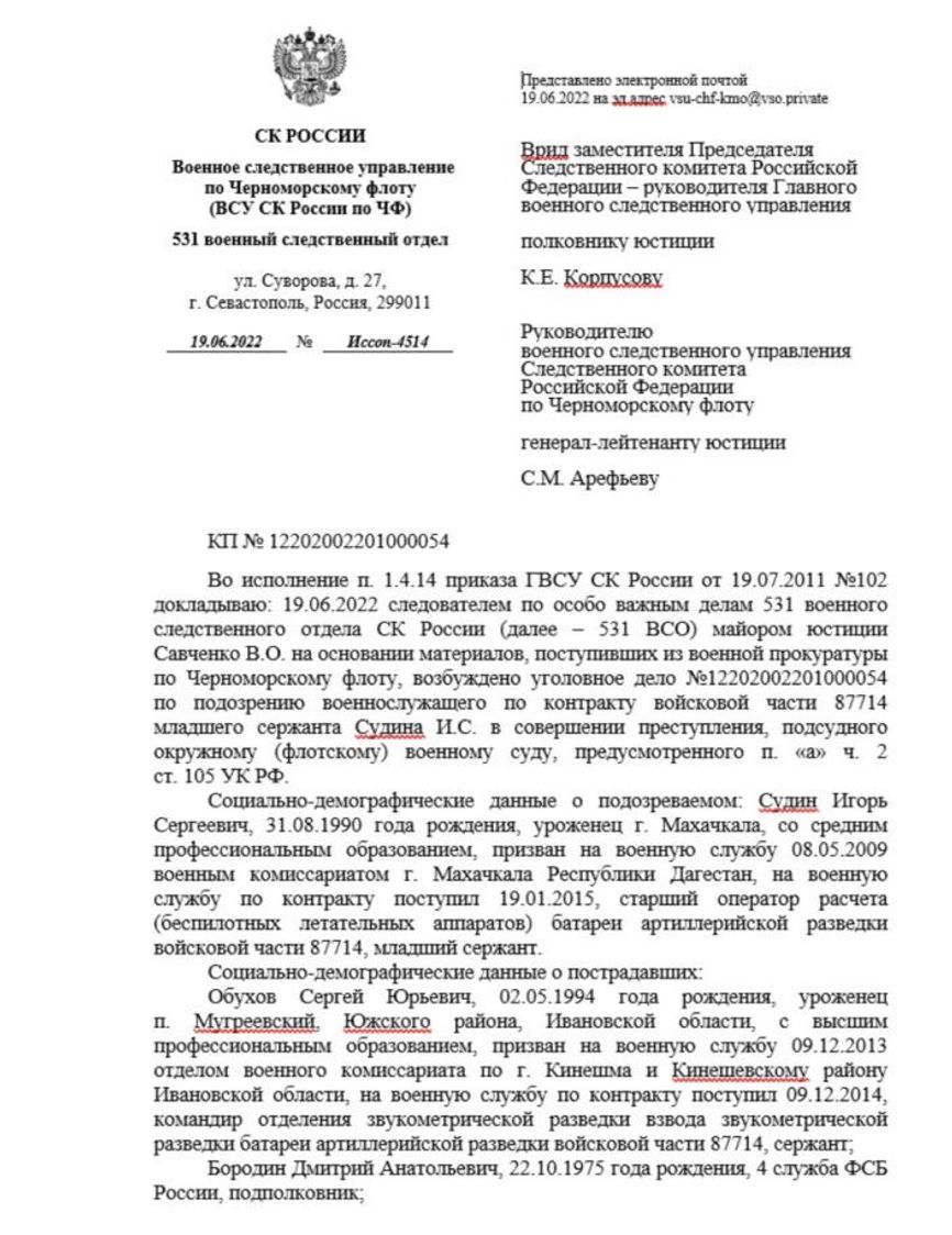 Obukhov, Privalov and Yakubinsky, according to the documents, "died on the spot", and Borodin and Sudin were "hospitalized with wounds of varying severity in the Federal Naval Clinical Hospital No. 1427 of the Ministry of Defense of Russia, located in Sevastopol." The fourth FSB officer, whose identity is not specified in the documents, fled the scene.