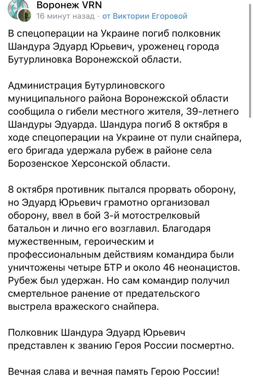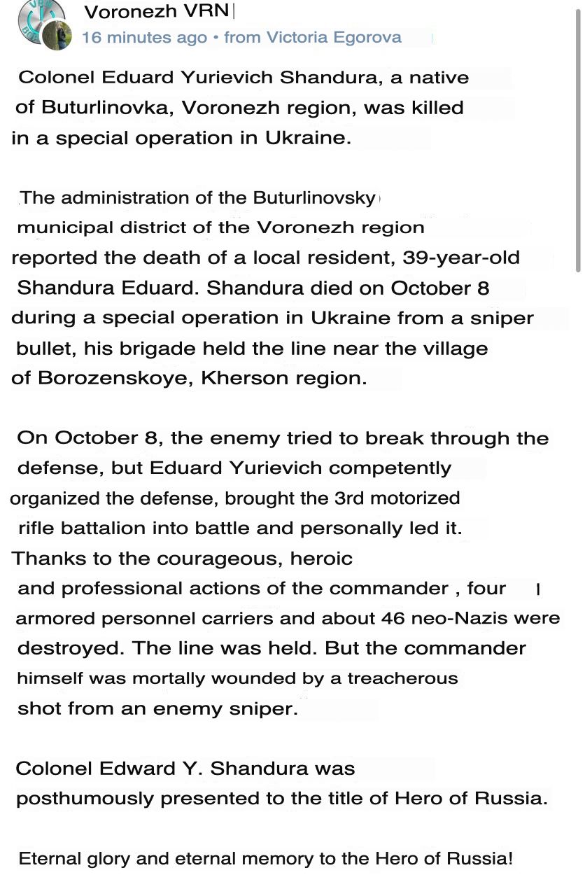 On October 8 the enemy tried to break through the defense, but Eduard had competently organized the defense, led the 3rd motorized rifle battalion into the battle and personally headed it. Due to the commander's courageous, heroic and professional actions, four APCs and about 46 [AFU soldiers] were destroyed. The line was held. But the commander himself was mortally wounded by a treacherous shot from an enemy sniper.