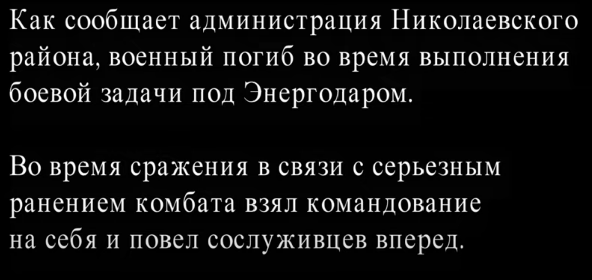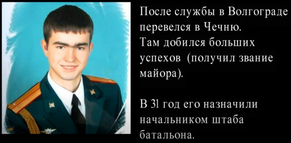 "According to the administration of the Mykolaiv district, a military man was killed while performing a combat mission near Energodar. During the battle, due to the serious injury of the battalion commander, he took command and led his colleagues forward.""In battle he was fatally wounded by a sniper.""After serving in Volgograd, he transferred to Chechnya. There he achieved great success (received the rank of major). At the age of 31, he was appointed chief of staff of the battalion."