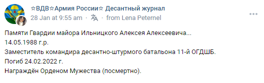 Alexei Ilnitsky is a graduate of the Chelbas School No. 26 and the Ryazan Guards Higher Airborne Command School. Since 2011, he served in the 11th separate Guards Airborne Assault Brigade in Ulan-Ude. An excellent officer of combat training. He participated in counterterrorist operations in the North Caucasus region.