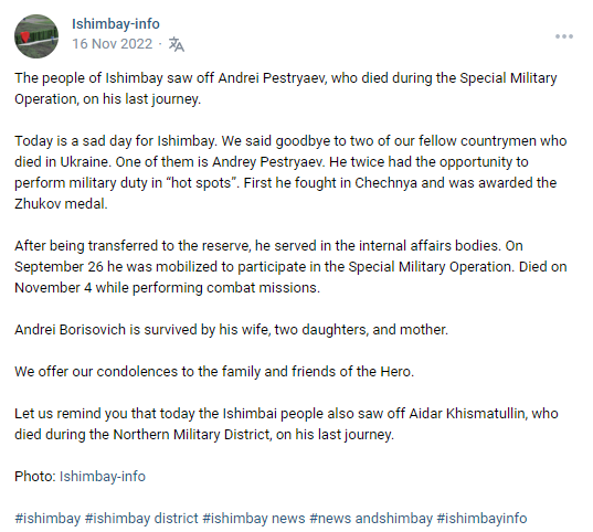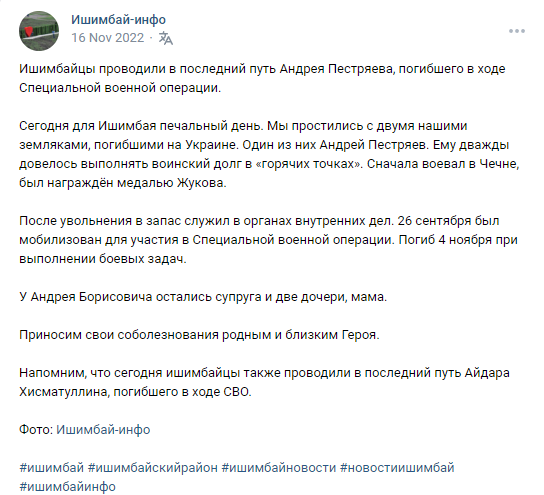 Today is a sad day for Ishimbay. We said goodbye to two of our fellow countrymen who died in Ukraine. One of them is Andrey Pestryaev. He twice had the opportunity to perform military duty in “hot spots”. First he fought in Chechnya and was awarded the Zhukov medal.
