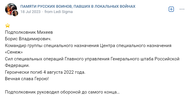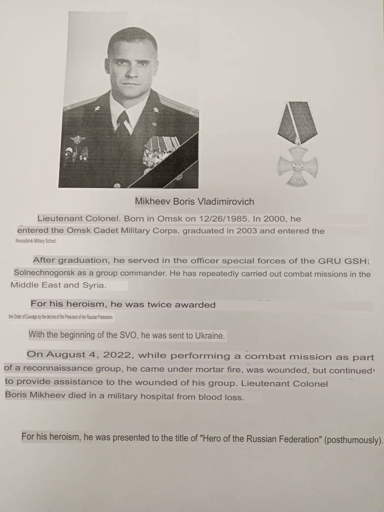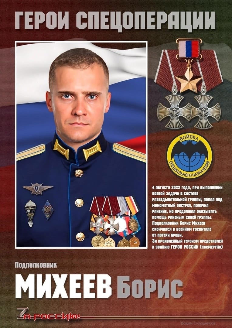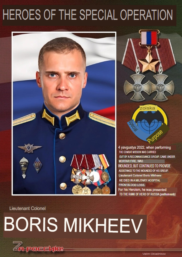 On August 4, 2022, while performing a combat mission as part of a reconnaissance group, he came under mortar fire, was wounded, but he continued to provide assistance to the wounded of his group. Lieutenant Colonel Boris Mikheev died in a military hospital from blood loss.