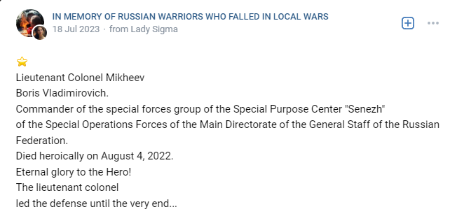 Evidence has surfaced that Lieutenant Colonel Boris Mikheev was killed with Major Nikolay Aseev and with Major Pavel Shtepa in the same battle.