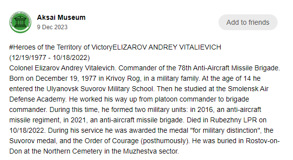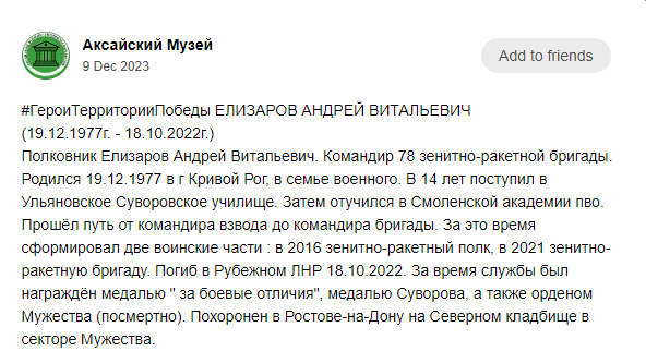 His comrades-in-arms spoke of him as a top-class, experienced commander who cared about his subordinates. During the time his brigade was in the combat zone, it did not lose a single soldier or officer. First of all it is a merit of Andrey Elizarov. He saved his men, but, unfortunately, he did not save himself... He was buried in Rostov-on-Don at the Northern Cemetery in the Muzhestva sector.