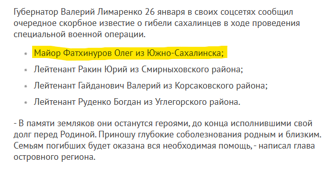 The Sakhalin Detachment, a branch of the Far Eastern Railway, regretfully announces the death during a special military operation of the Armed Forces of the Russian Federation on the territory of Ukraine of the engineer of the Department of the detachment Oleg Akhnafovich Fatkhinurov, Major of the Armed Forces of the Russian Federation.