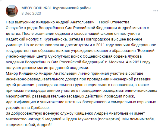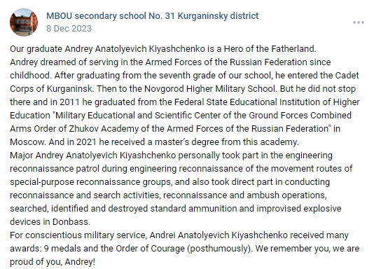 Education: Novgorod Higher Military School, "Military Educational and Scientific Center of the Ground Forces Combined Arms Academy of the Armed Forces of the Russian Federation". (Graduated 2021)