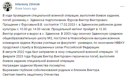 In August 2022, he was sent to the zone of a special military operation. On February 10, 2023, Viktor Viktorovich Furtsev died.