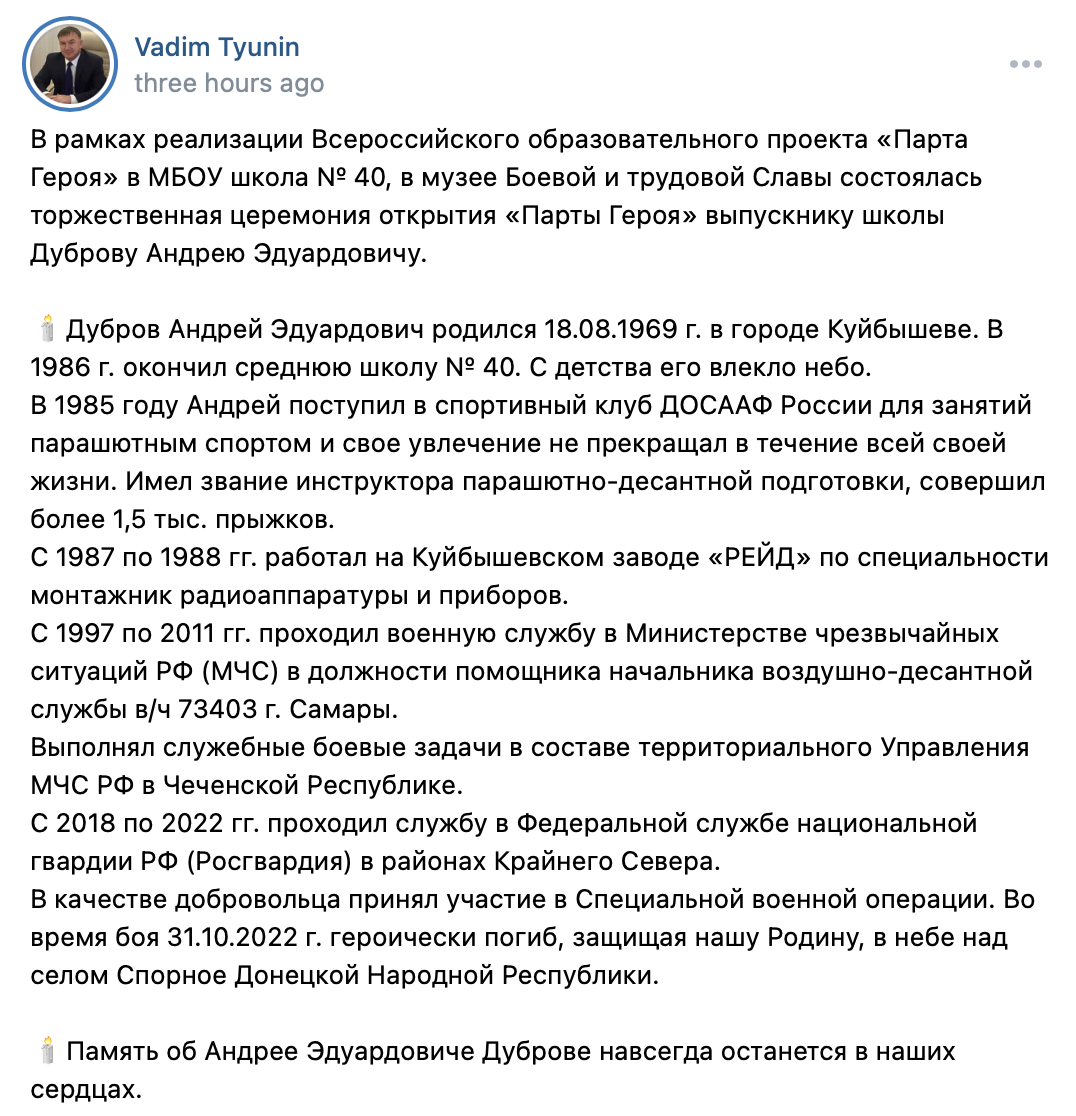 As a volunteer, he took part in the Special Military Operation. During the battle on 31.10.2022, he heroically died defending our Motherland in the sky over the village of Spornoye in the Donetsk People's Republic.